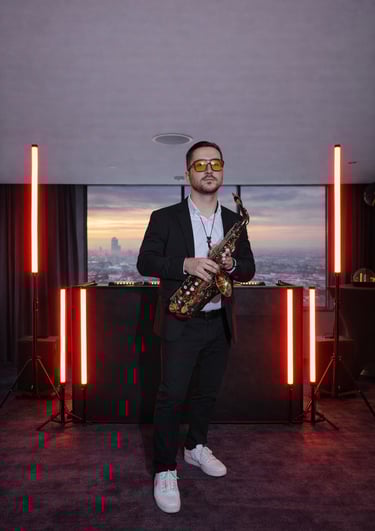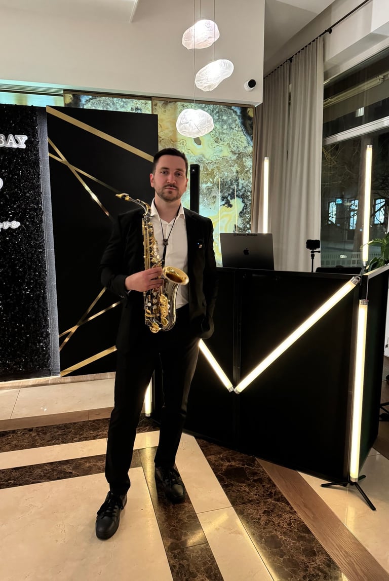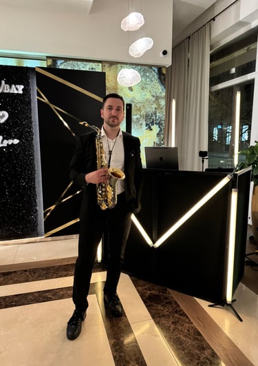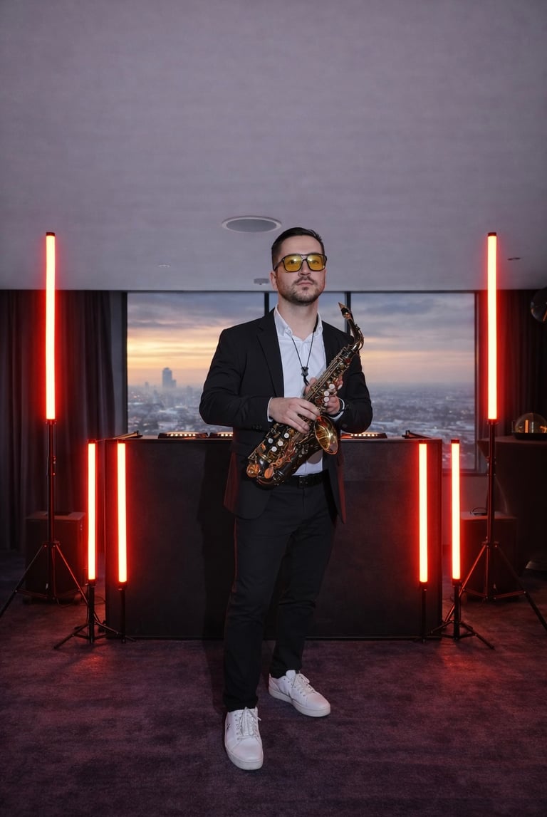 Saksofonistas - DJ viename – tai unikalus gyvo garso pasirodymas. Gyvas saksofono skambesys susilieja su profesionaliai parinkta DJ muzika, o renginio ar šventės atmosfera auga kartu su muzika – nuo ramios, jaukios pradžios iki energingos, šokti kviečiančios kulminacijos. Vakaro pradžioje skamba lėtesni pop, lounge ir jazz stiliaus kūriniai su gyvomis saksofono partijomis, idealiai tinkantys svečių sutikimui ar foninei vakarienės muzikai, o vakarui įsibėgėjus muzika tampa ritmingesnė ir įtraukianti, sukurianti pilną šokių aikštelės nuotaiką. Pasirodymui užtikrinamas pilnas techninis sprendimas – profesionalus įgarsinimas su 4,4 kW galios JBL PRX serijos garso sistema, bei modernus vizualinis apšvietimas prie DJ stalo su Ape Labs Neon Tube PIX LED vamzdžiais, kurie suteikia pasirodymui estetikos ir dinamikos. Tai ne tik foninė muzika, o gyva muzikinė patirtis, kuri prisitaiko prie renginio eigos ir kuria tikrą šventės emociją.